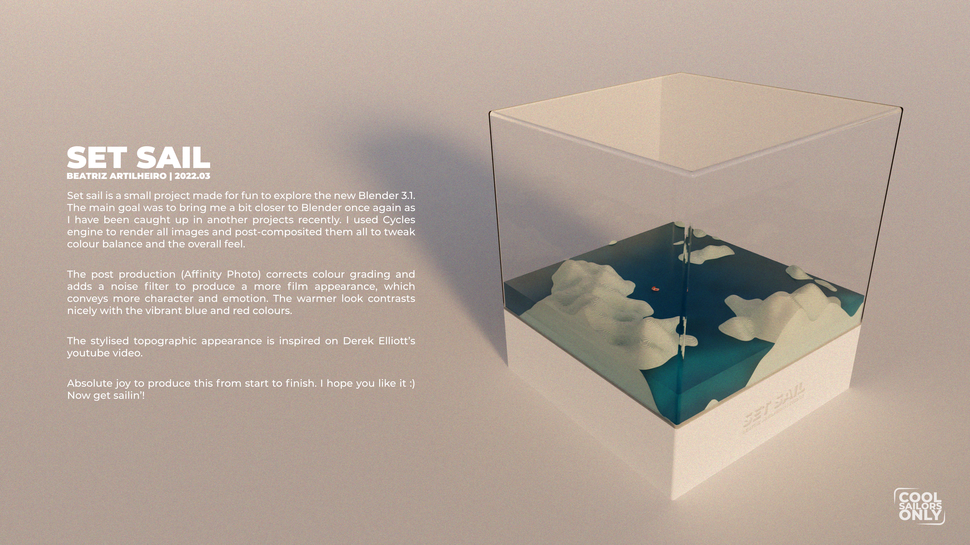 Set sail is a small project made for fun to explore the new Blender 3.1. The main goal was to bring me a bit closer to Blender once again as I have been caught up in another projects recently. I used Cycles engine to render all images and post-composited them all to tweak colour balance and the overall feel. The post production (Affinity Photo) corrects colour grading and adds a noise filter to produce a more film appearance, which conveys more character and emotion. The warmer look contrasts nicely with the vibrant blue and red colours. The stylised topographic appearance is inspired on Derek Elliott’s youtube video. Absolute joy to produce this from start to finish. I hope you like it :) Now get sailin’!